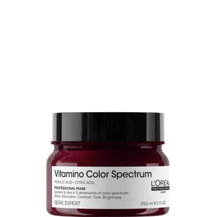 Vitamino Color Spectrum Professional mask by L’Oréal Professionnel, formulated with Ferulic Acid and Citric Acid. The mask with its luxurious creamy texture, intensely cares for hair fibre, especially for thicker hair types. The system helps to lock dyes within the fibre using patented technology to coat the hair fibre instantly.
